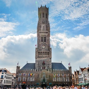 Iconic 83m medieval bell tower and bustling market square, the heart of Bruges